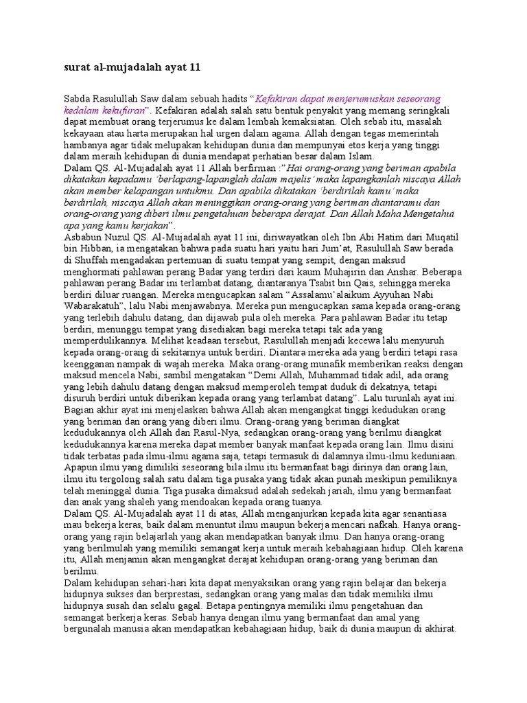 Tetapi jika kamu tidak memperoleh (yang akan disedekahkan) maka sungguh, allah maha pengampun, maha penyayang. (maka dirubah kepada kasroh karna menyelamatkan bacaan dari bertemunya dua sukun. Surat al mujadalah ayat 11 menjelaskan tentang adab saat menghadiri mejelis dan pentingnya ilmu sebagai pegangan hidup manusia. Mujadalah ayat · hukum bacaan alif lam. Informasi tentang isi kandungan dari surat al mujadalah ayat 11 disertai tulisan teks arab dan latin beserta terjemah bahasa indonesia . Untuk sobat yang ingin mengetahui hukum bacaan tajwid pada ayat ini,. Sikap dan perilaku terpuji yang dapat diterapkan sebagai penghayatan dan pengamalan qs al mujadalah ayat 11. Berikut ini adalah teks bacaan surat al mujadilah ayat 11 teks arab .